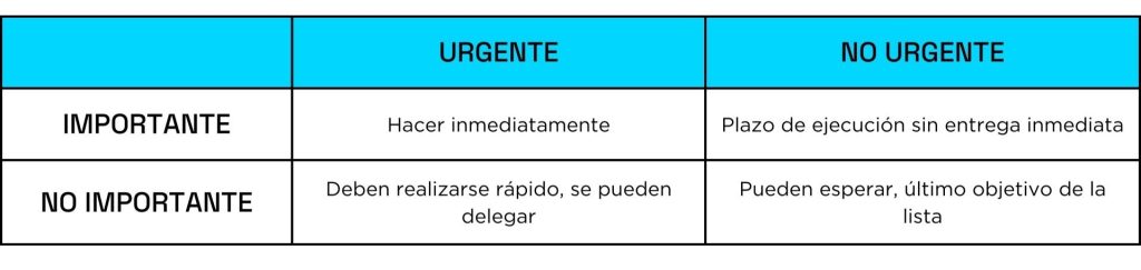 • Matriz de Eisenhower: Se trata de una matriz que ayuda a priorizar lo urgente de lo importante mediante un sistema de cuadrantes, pudiendo establecer las tareas en diferentes espacios para darle la importancia necesaria.